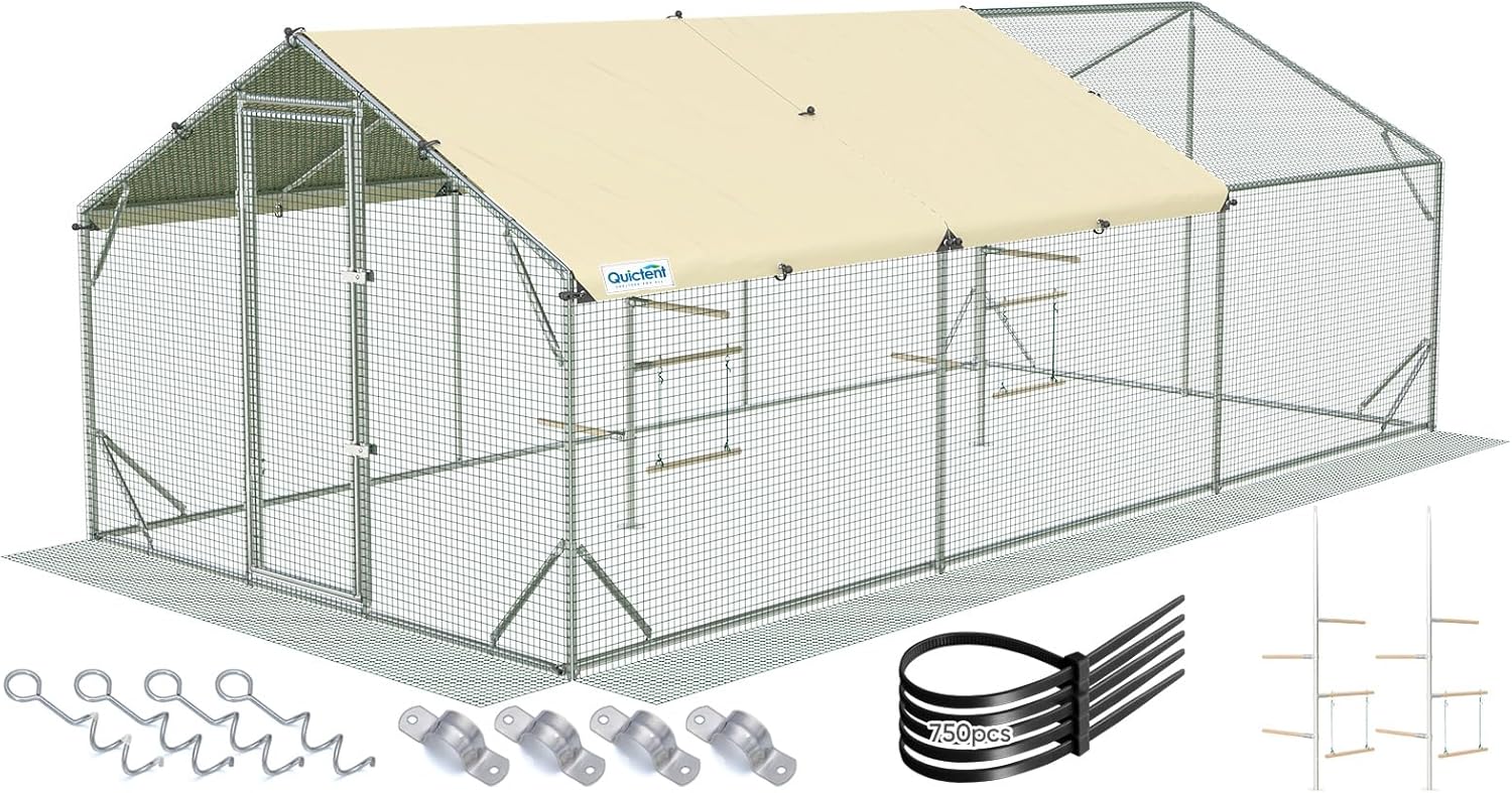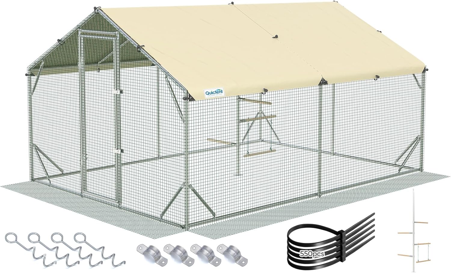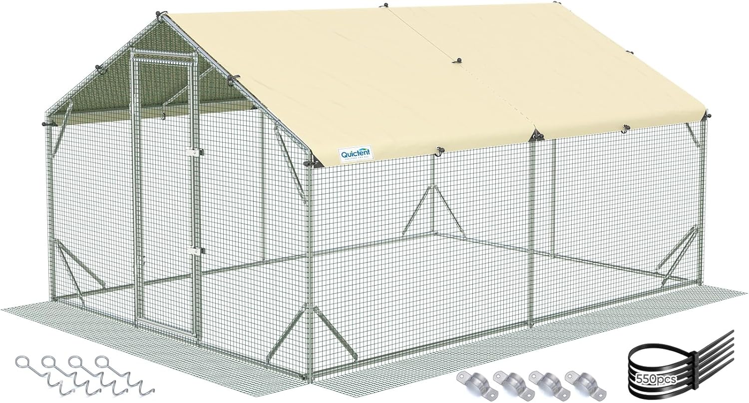 Quictent Elite Series 12x9x6.6ft Metal Chicken Coop Run with Side Hardware Cloth, Walk-in Outdoor Poultry Cage Heavy Duty Predator Proof Hen Duck Rabbit Farm House, Waterproof Anti-UV Cover