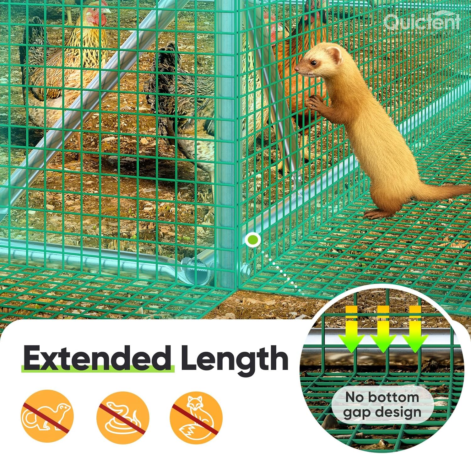 [Ultimate Security] - The side walls are built with Premium PVC-coated Hardware Cloth to thwart predators like raccoons and foxes while protecting your chickens from sharp edges. We’ve added an extended mesh ground skirt to prevent predators from digging under, while the dual-latch door ensures no intruder can pry their way in.
