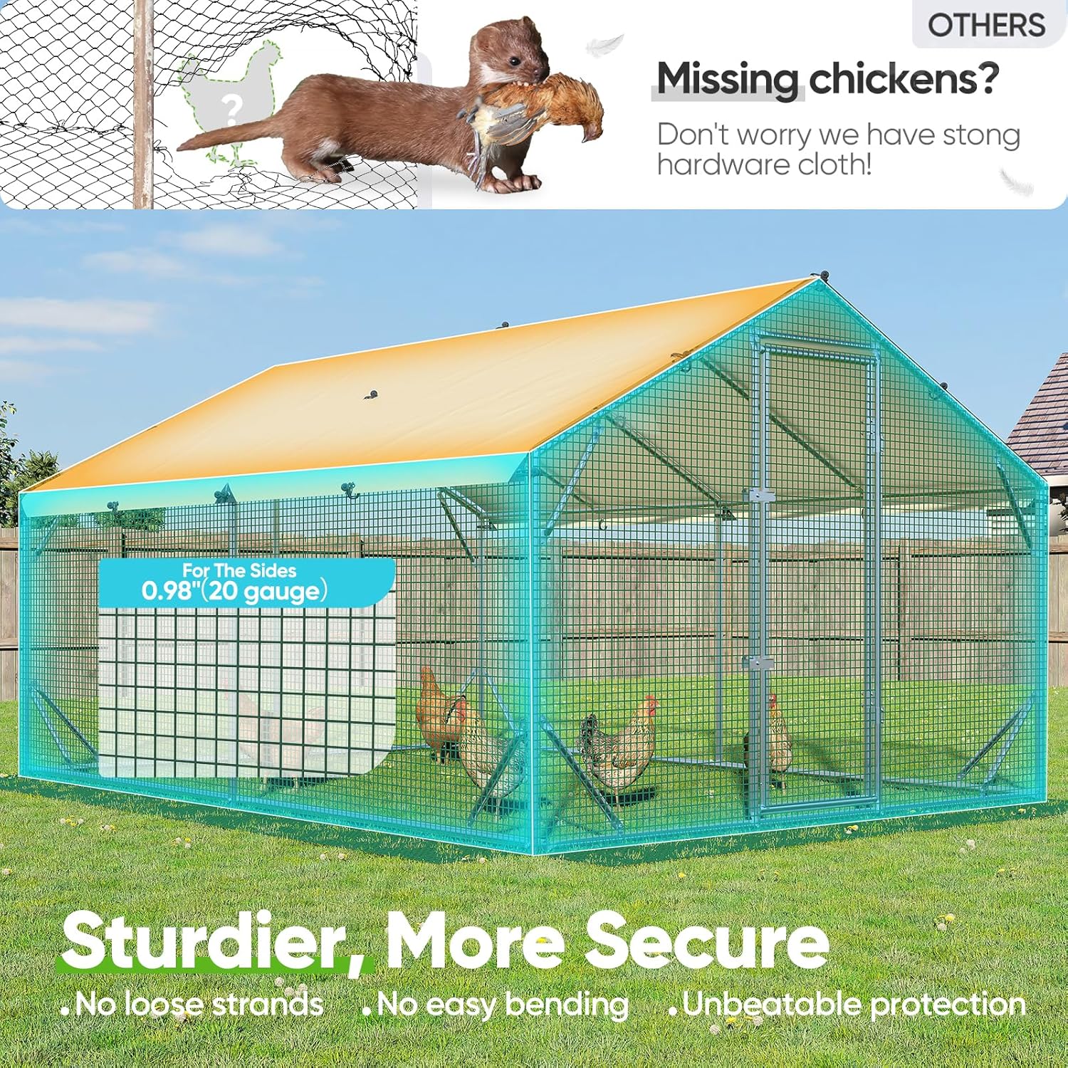 [Weather Protection] - Includes 2 piece of 180g/sqm (others: 130g/sqm) waterproof UV-resistant PE covers with elastic ball straps to keep your flock dry and shaded. The PVC-coated steel mesh offers superior weather resistance against corrosion. With a user-friendly push-button frame, the tool-free assembly is quick and hassle-free for a worry-free setup.