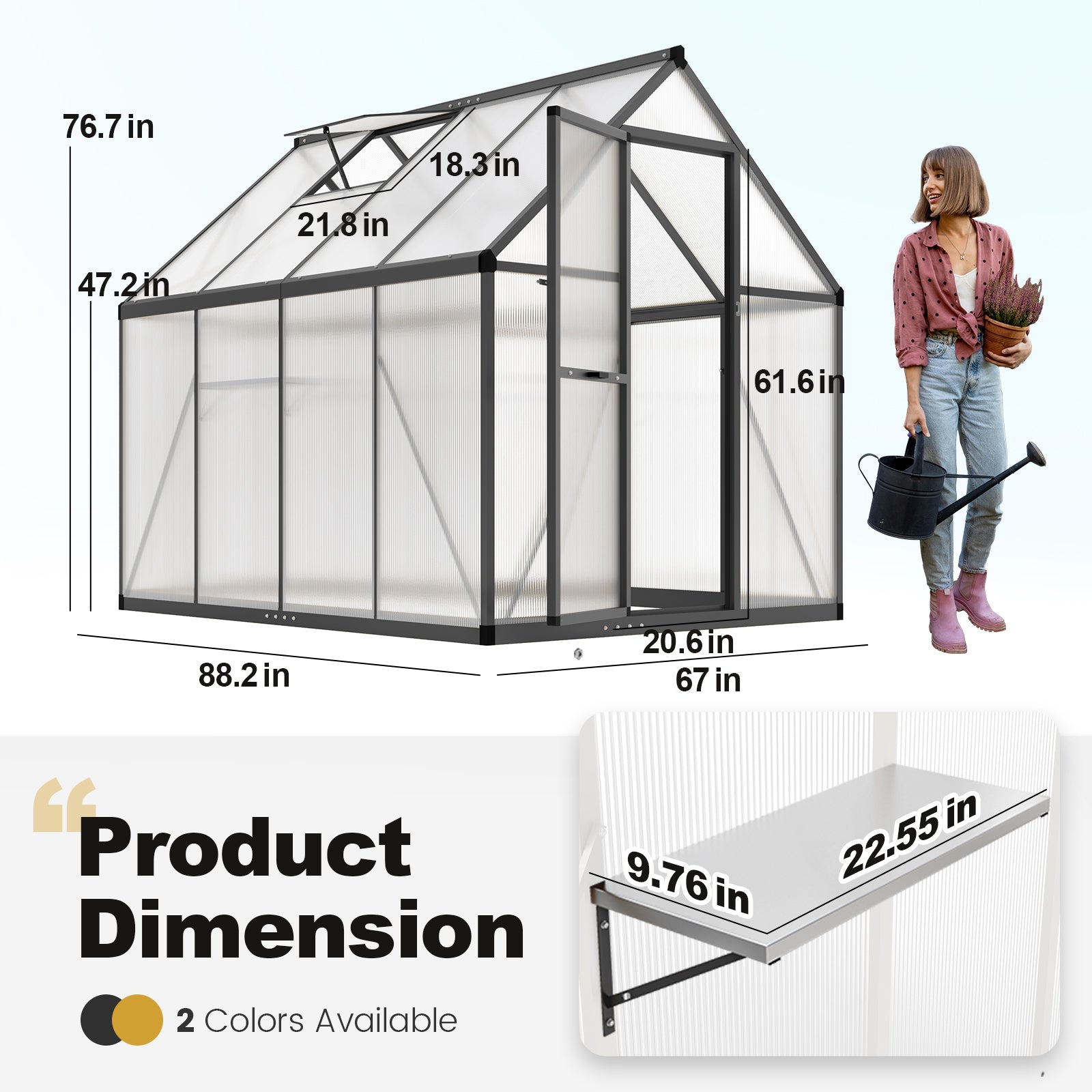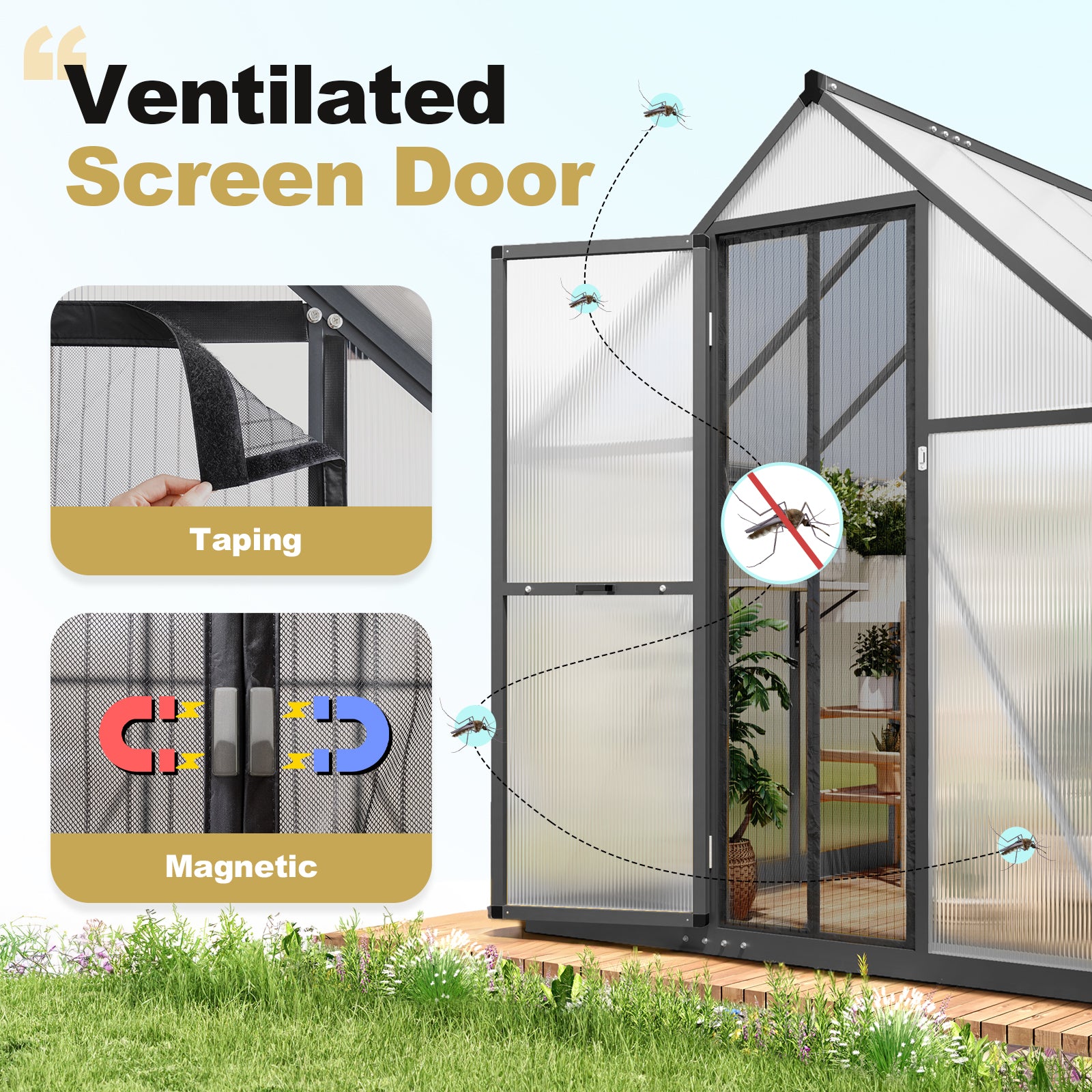 KING BIRD Greenhouse for Outdoors, 7.4x6 FT Polycarbonate Walk-in Green House for Outside, Aluminum Frame UV Resistant Panel Garden Backyard W/ Lockable Mesh Door Roof Vent, 2 Racks, Black