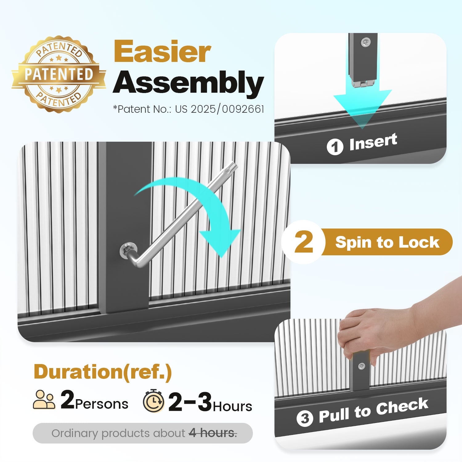- Quick-Connect Frame: This KING BIRD polycarbonate(PC) greenhouse is built with aluminum sturdy frame. The patented(US0092661) Quick-connect system simplifies the process which reduces 60% of installation time, allowing 2-3 people to easy assemble in 2-5 hours (varied with sizes) under our concise and clear instructions/video(See in Photo Gallery) compared to other items.
