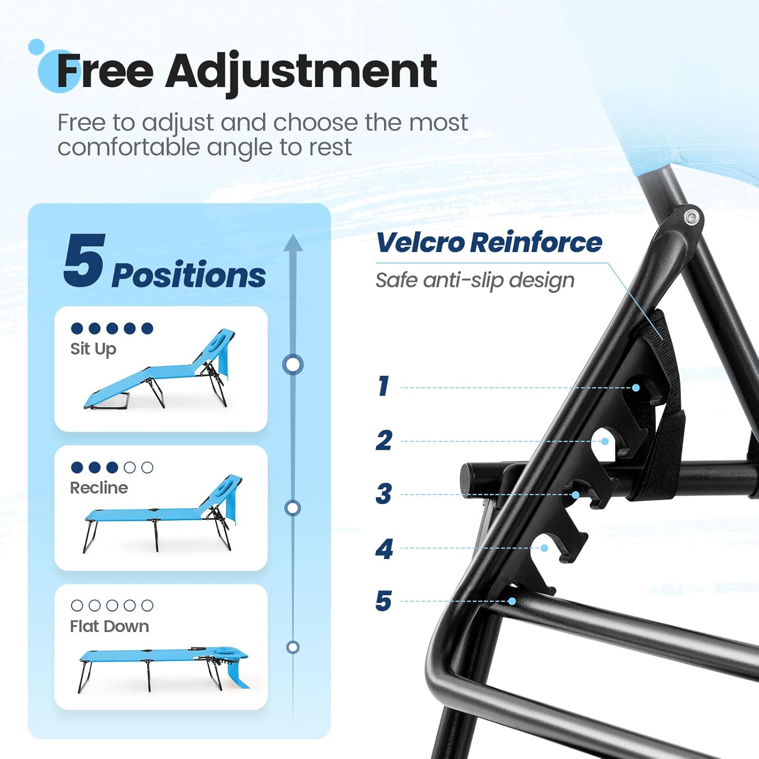 KING BIRD Tanning Chair with Face Hole, 5-Position Folding Outdoor Beach Lounge Chair for Sunbathing, Portable Reclining Chaise Lounge for Pool, Patio & Lawn, Heavy Duty 400lbs Support, Blue