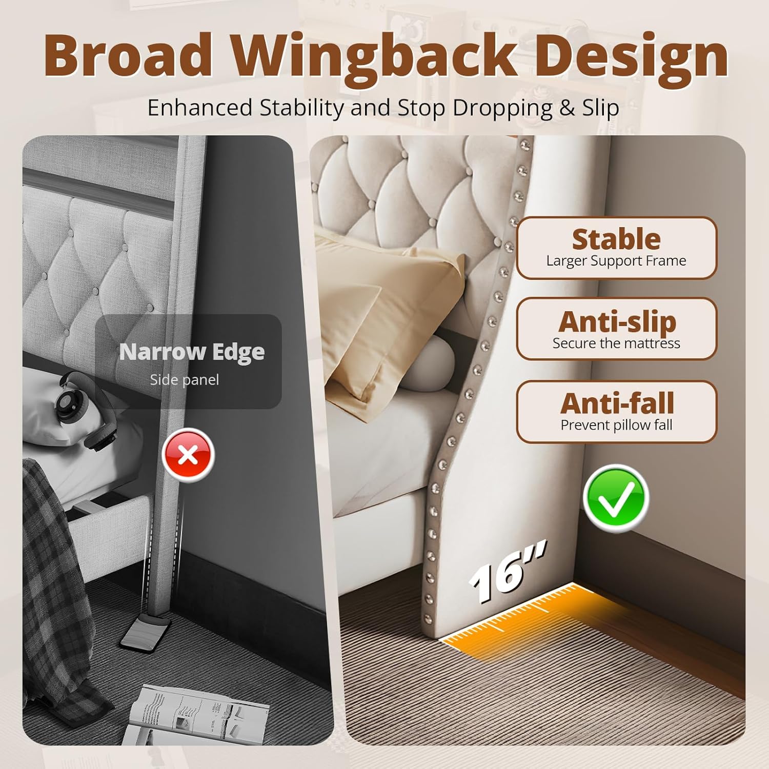 - Stylish Appearance that Decorates Your Room: This modern bed frame is deep button tufted, with 48inch tall headboard and widened wingback edge helps secure the mattress and prevent pillows falling, make your room clean and beautiful.