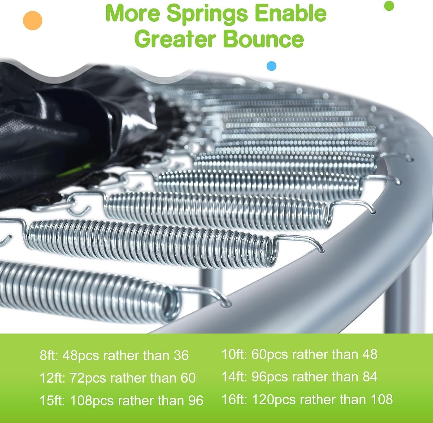 • ❤️【More Springs & Impressive bounce】 As we all know springs are the core of the trampoline, we have 12 more 7inch hot-dip galvanizing springs to offer impressive bounce.