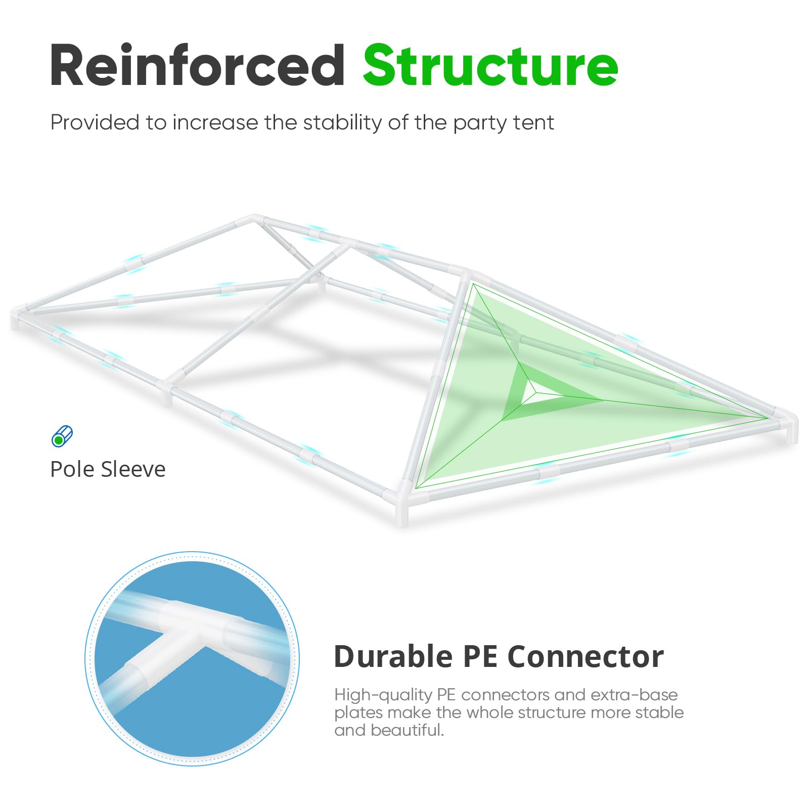 - ✅【REINFORED FRAMEWORK】All top pole connections are reinforced with additional PE sleeve connectors making the entire tent more stable and safe.